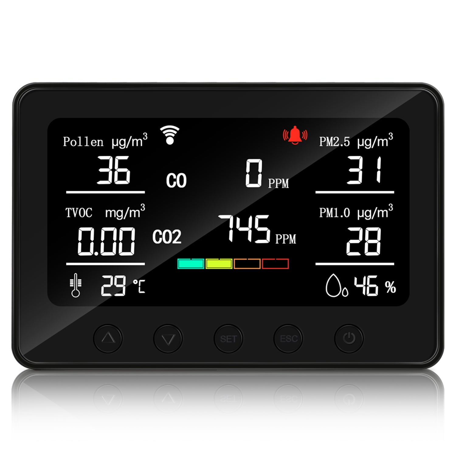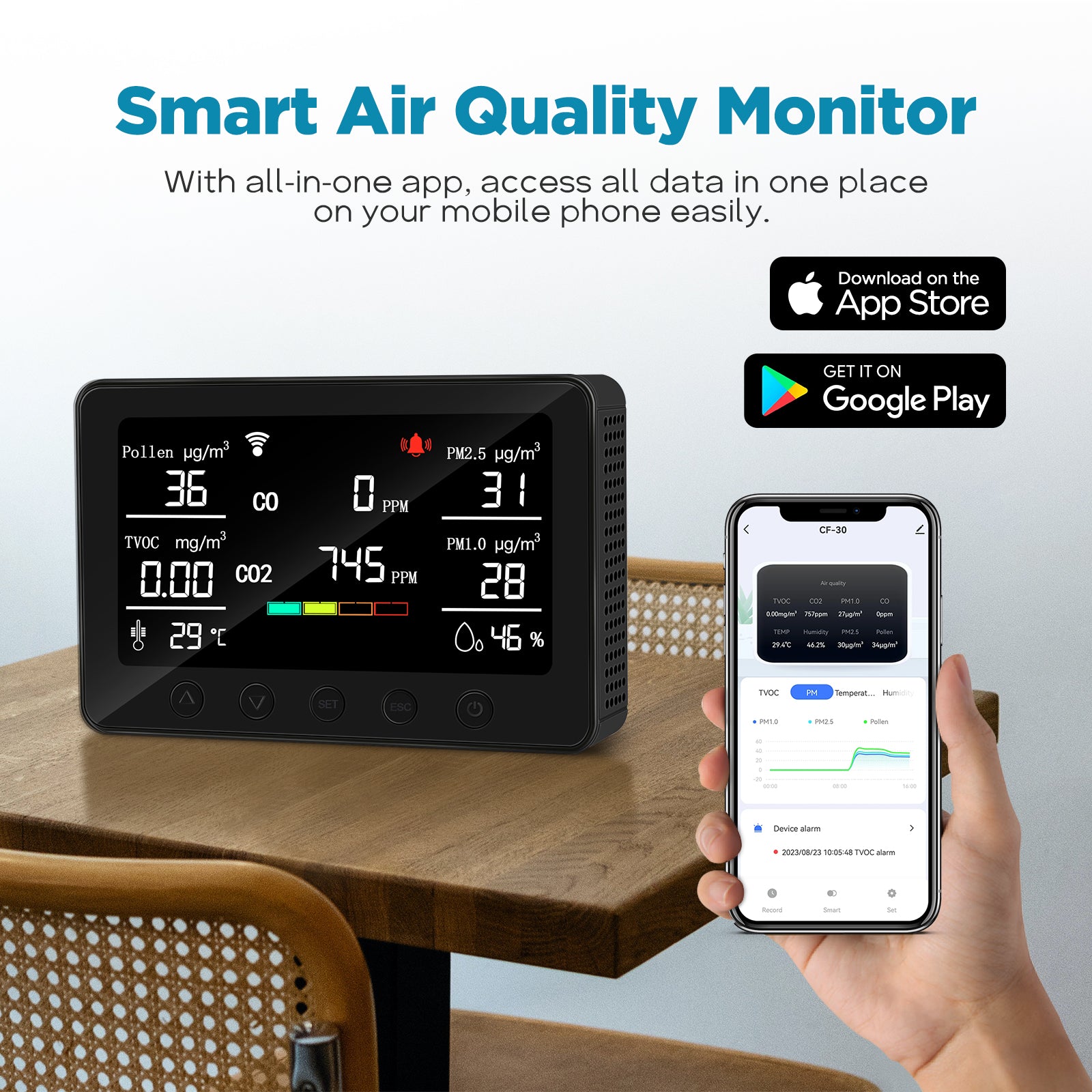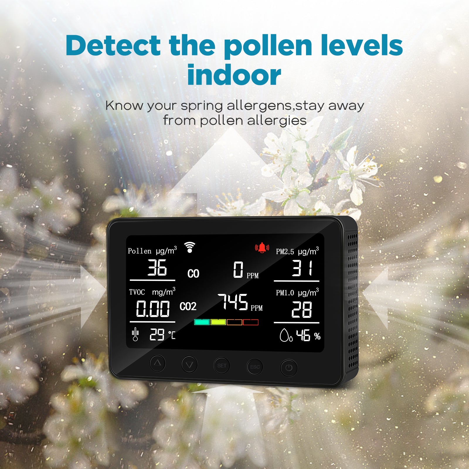 • ๐˜พ๐™๐™š๐™˜๐™  ๐™‹๐™ค๐™ก๐™ก๐™š๐™ฃ ๐˜พ๐™ค๐™ช๐™ฃ๐™ฉ๏ผšAllergies are brutal at any time of year, the air quality detectors indoor track your pollen levels indoor and air quality indoors for a healthy environment which can effectively prevent the occurrence of allergies and other symptoms.