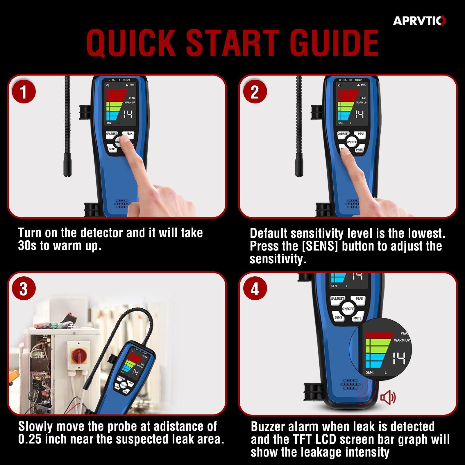 - 【High Sensitivity and Adjustable】Compared with traditional freon leak detectors, ALD-200 ac leak detector sniffer is more accurate and less susceptible to interference from other gases. 3 modes of sensitivity with maximum sensitivity up to 0.14oz./yr. 16 inch sensor probes of the hvac leak detector that allows you to reach hard-to-reach areas.